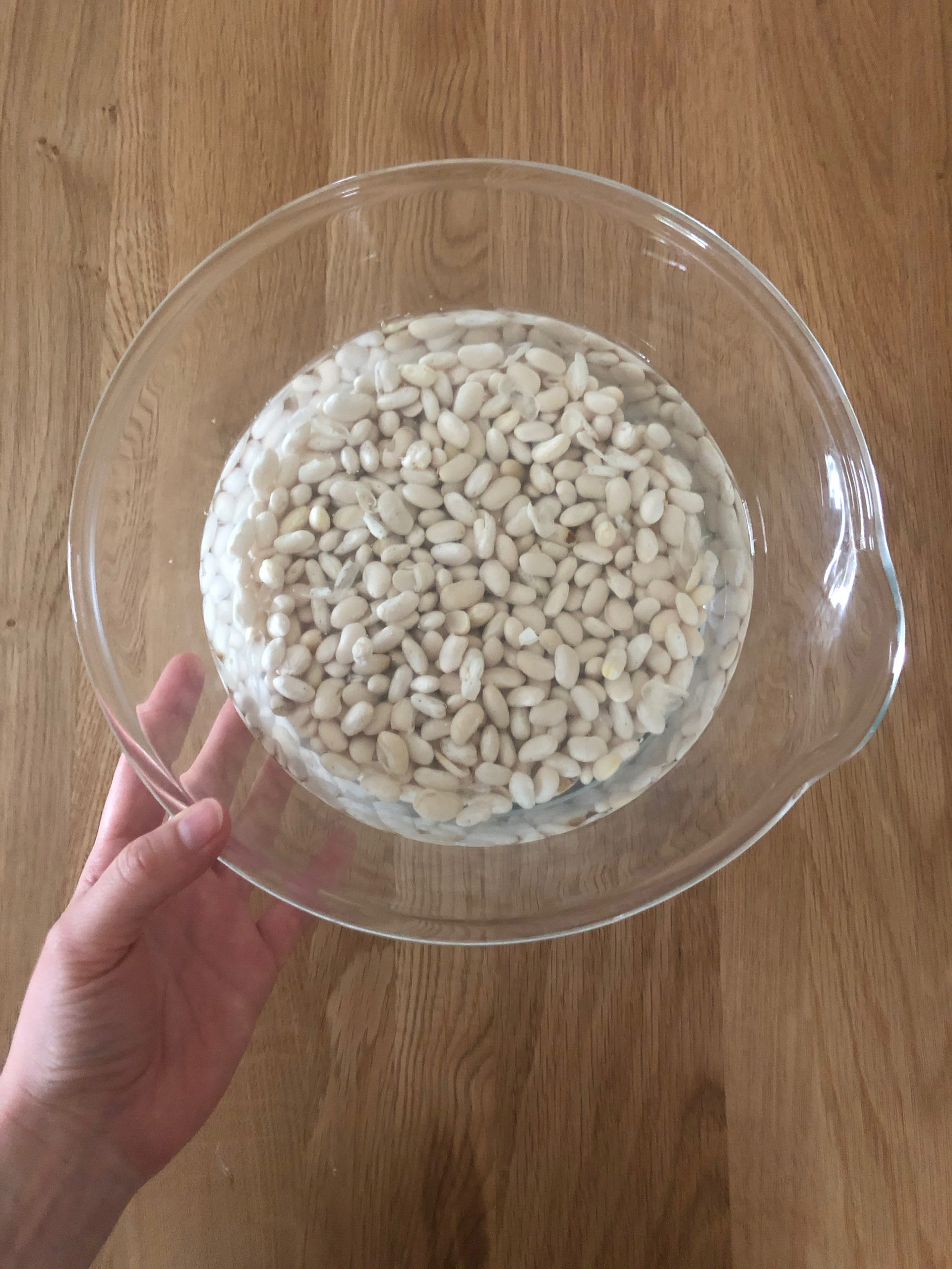 1. Preparing brothy beans really starts the night before. Rinse one cup of beans and add to a large glass or ceramic bowl. Cover with water by a few inches and let soak overnight. 8-12 hours is good.