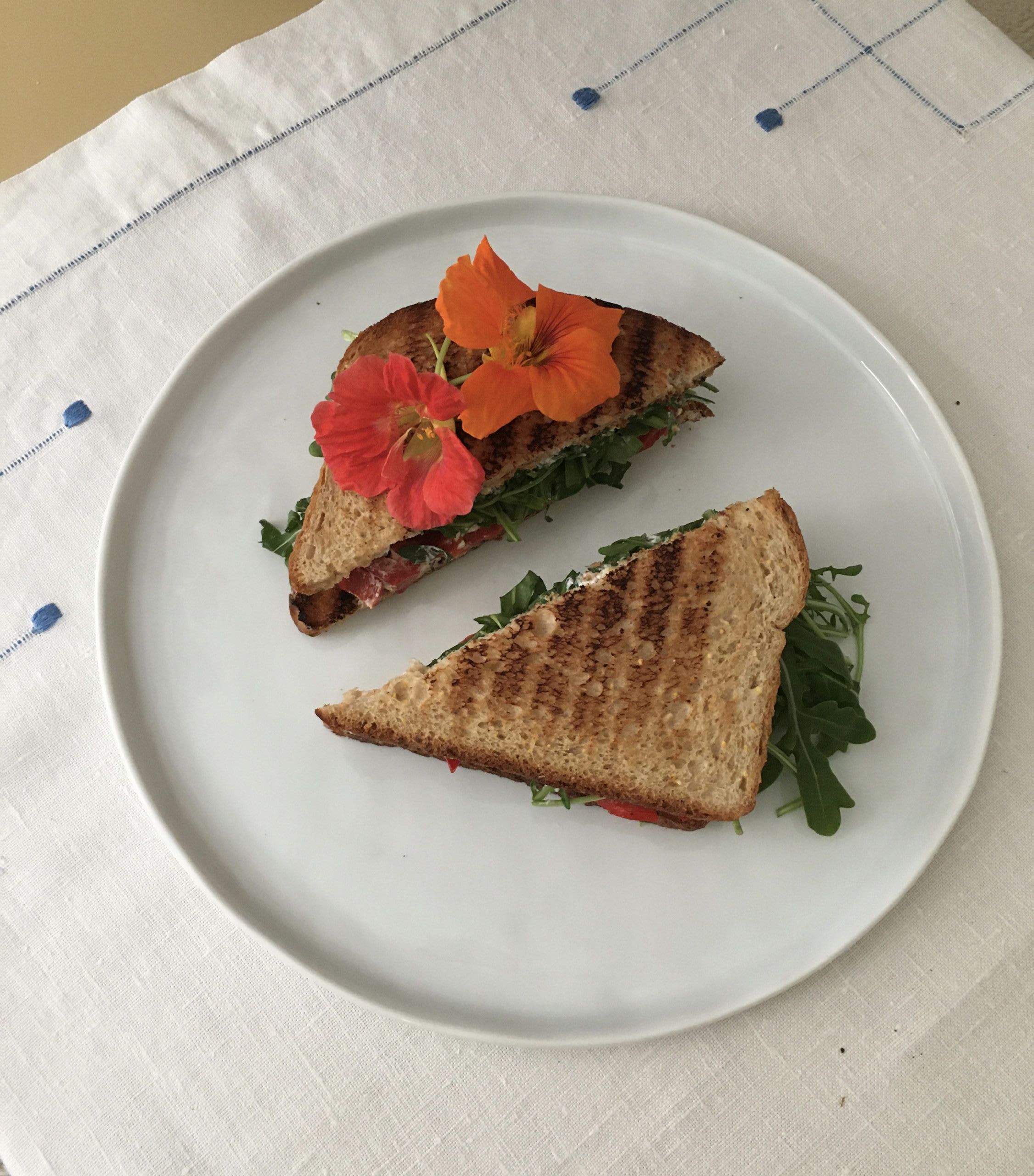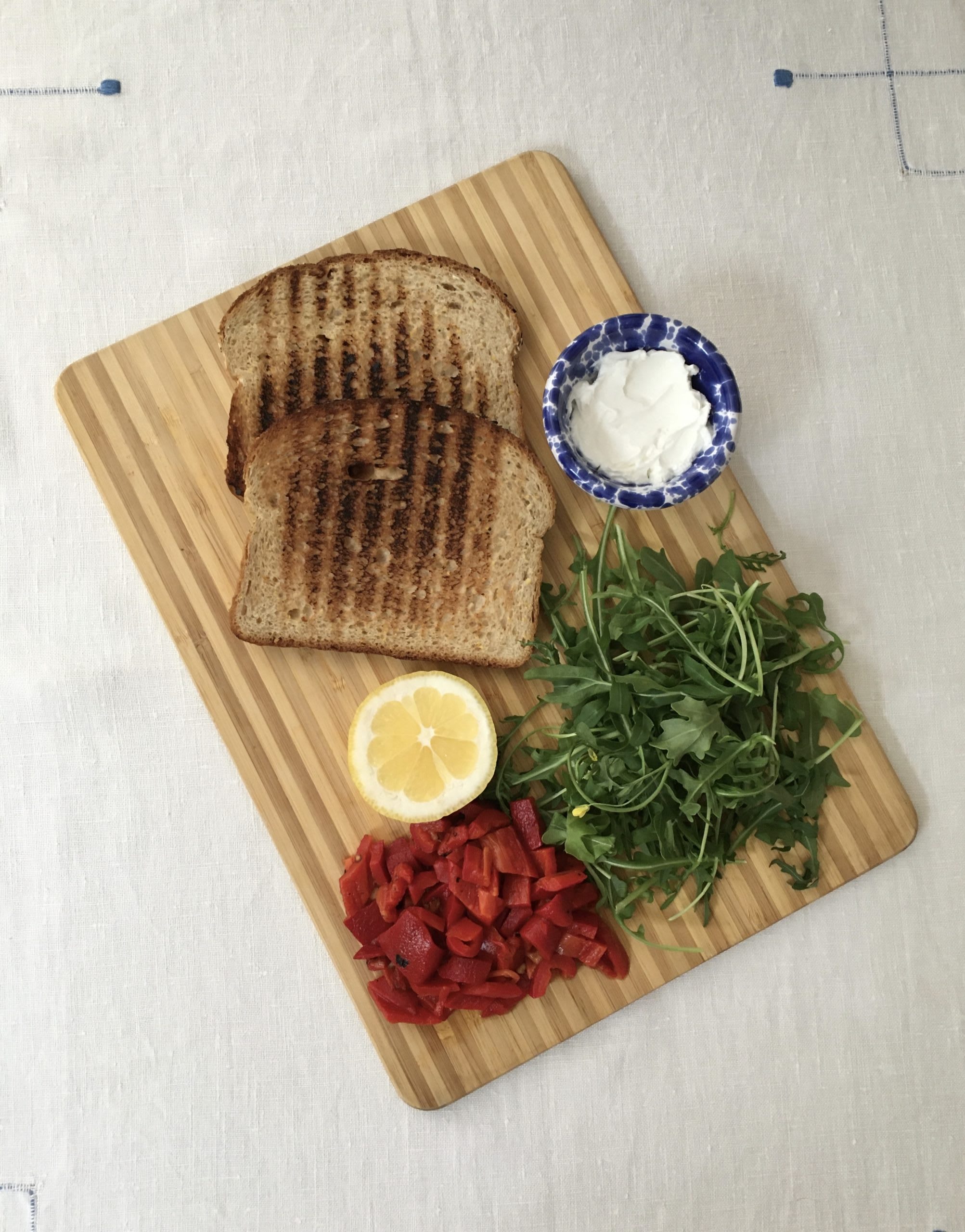 4.Top one half with chopped roasted peppers, then a handful of arugula or watercress, a few turns of fresh ground pepper and cover with the other slice of bread.